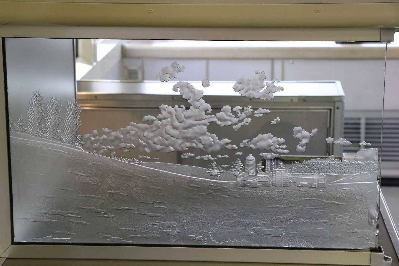 仕切りには、北海道らしいイラストが描かれたガラスが入っている。