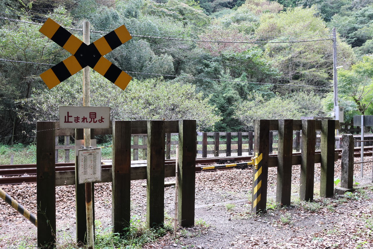 山道を降りると、常時遮断機が降りている踏切に出る。