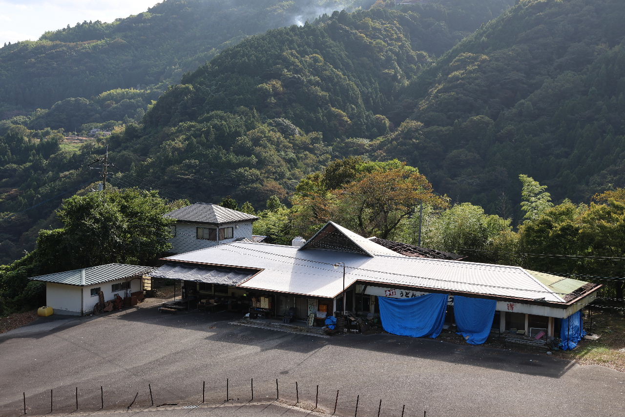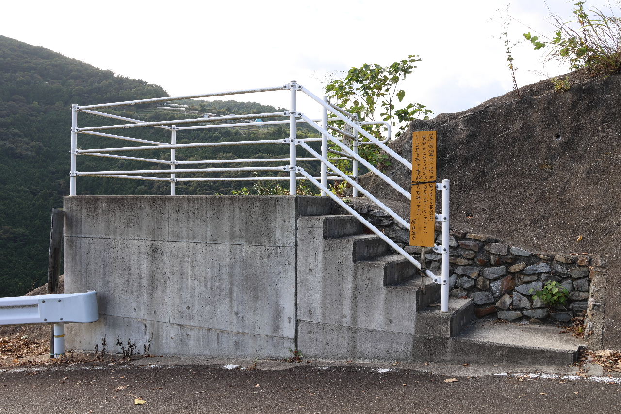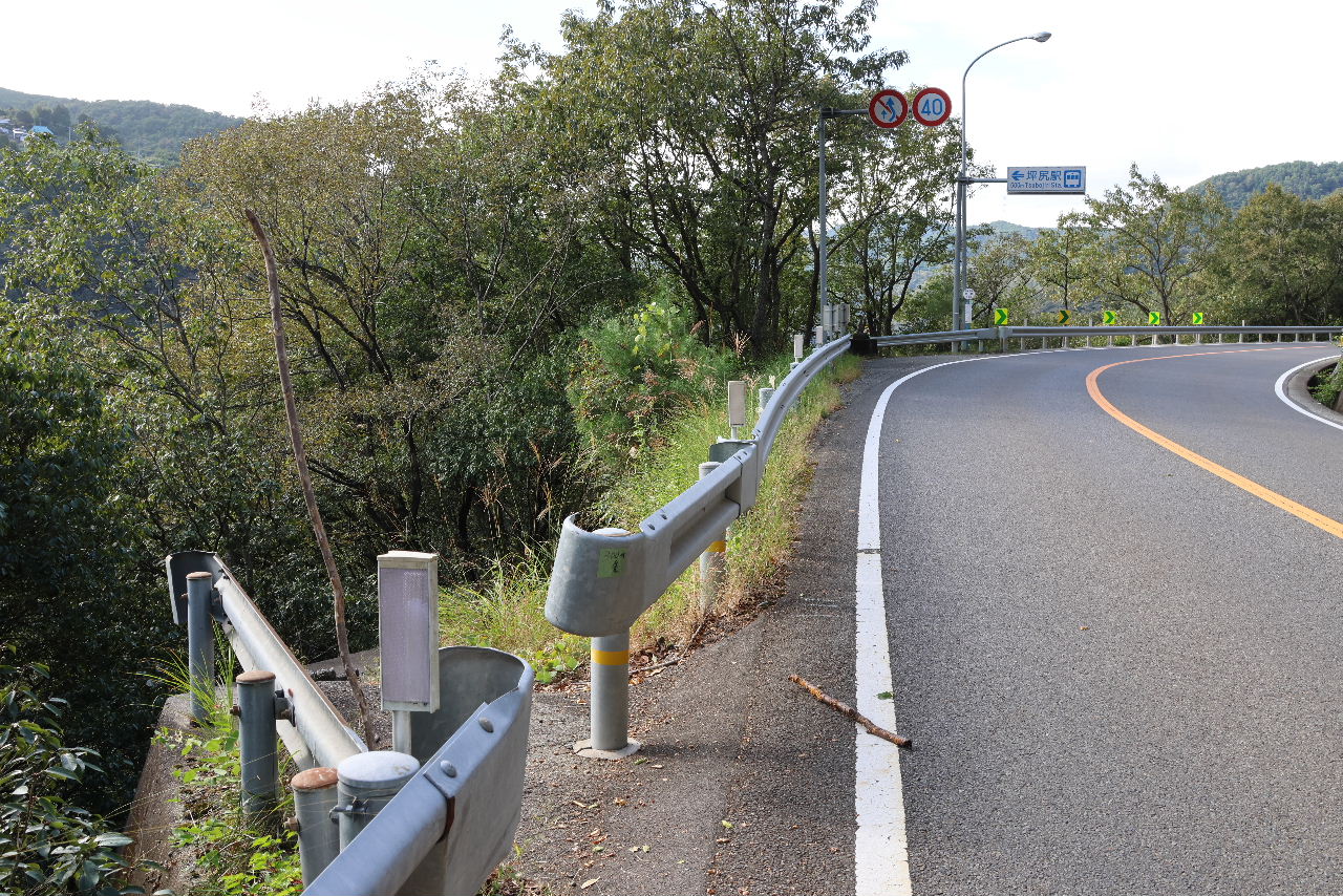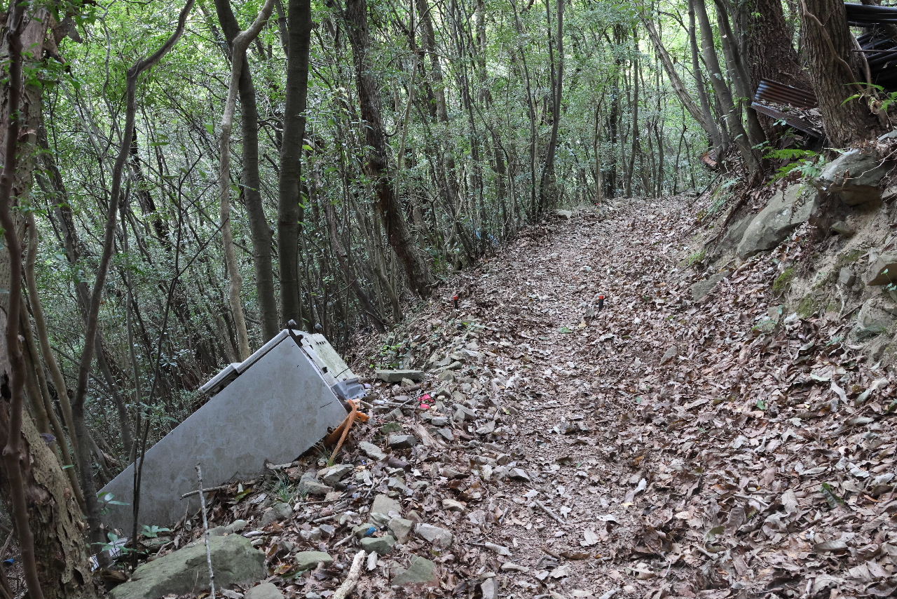 山道には冷蔵庫などの粗大ごみも落ちている。