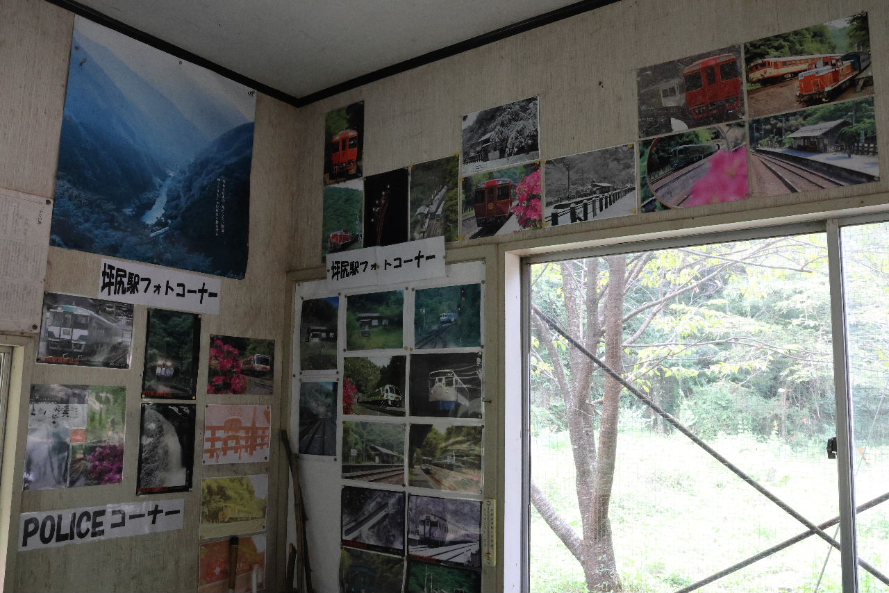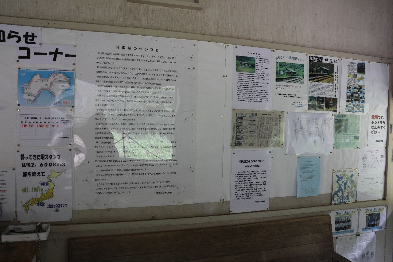 お知らせコーナーには、坪尻駅の情報や新聞などの記事が掲示されている。