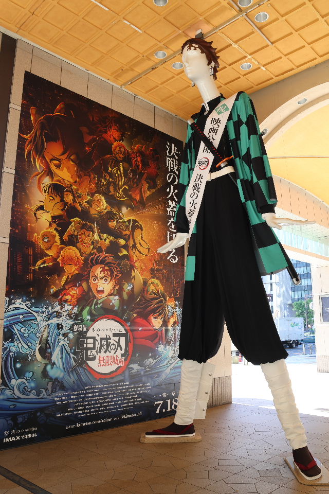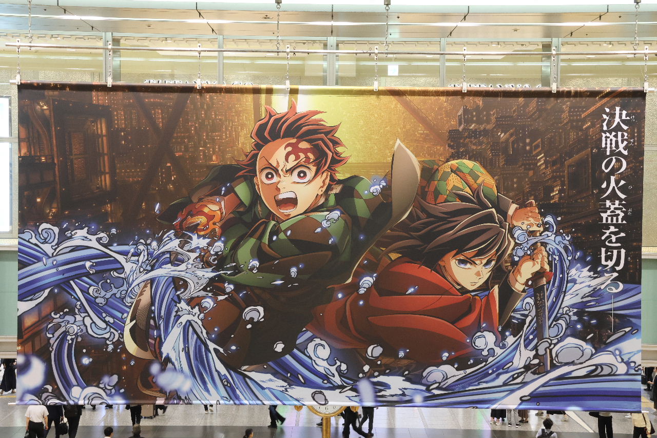 JR名古屋駅は、「鬼滅の刃」の広告が垂れ下がっている。